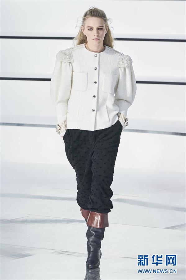3月3日,在法国巴黎时装周上,模特展示香奈儿品牌2020/21秋冬高级成衣。 本次香奈儿新品成衣以品牌标志性的黑色白色为主,穿插几许淡绿,与标志性的粉红色系,带来一丝独特的柔和与鲜明的轮廓。 新华社发(皮耶罗·比亚西翁 摄)