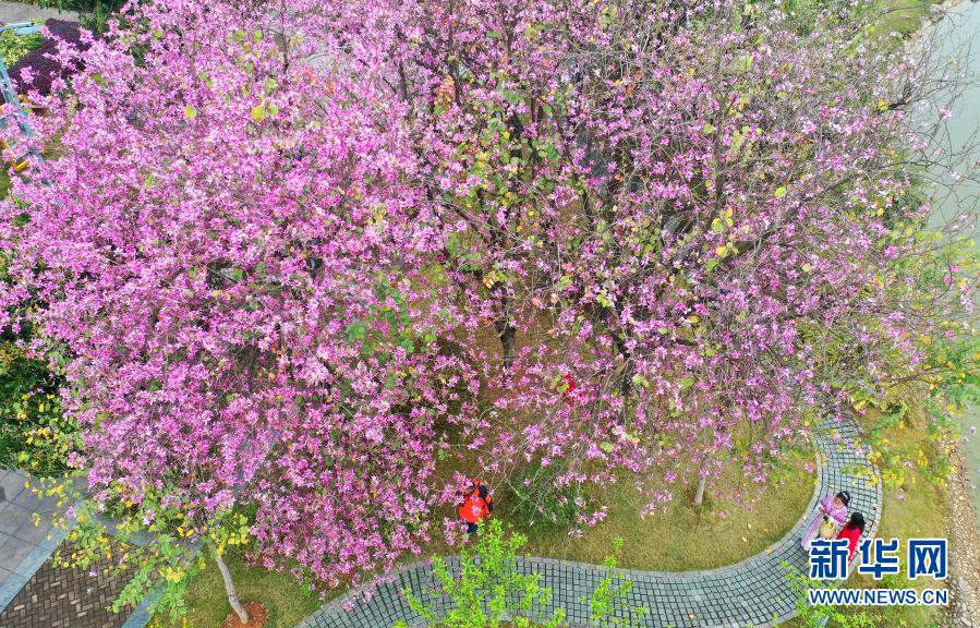 2月28日,广西柳州市民广场上洋紫荆盛开,市民在花下拍照留影(无人机照片)。
