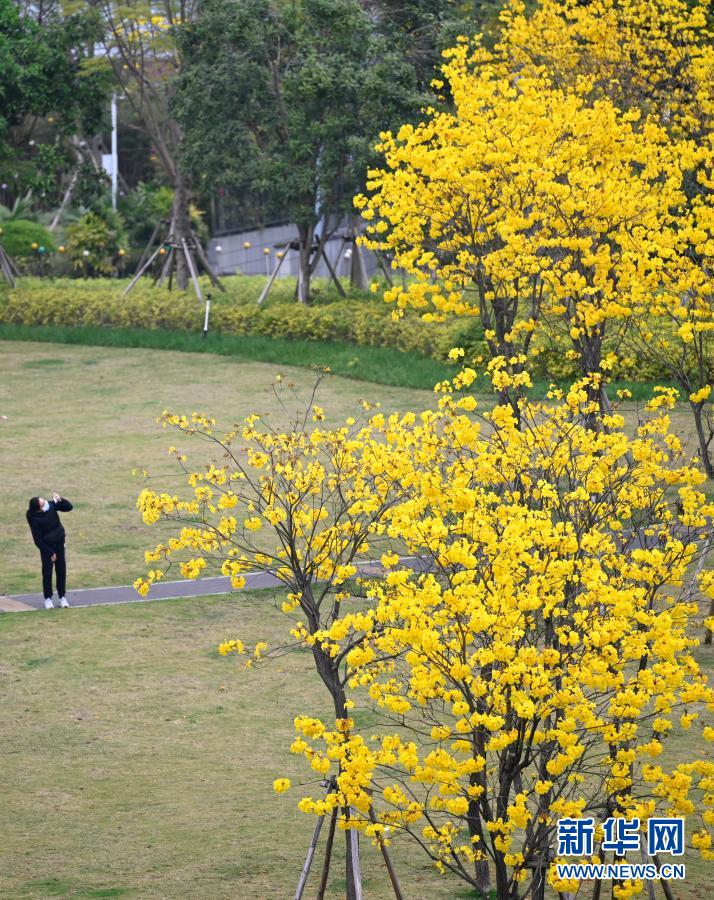 2月28日,游人在广西柳州市壶东大桥旁小游园里观赏黄花风铃木。
