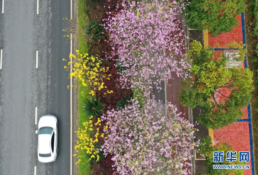 2月28日,广西柳州市学院路上洋紫荆和黄花风铃木竞相开放(无人机照片)。
